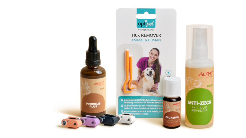ANiFiT bietet verschiedene, natürliche Mittel zum Schutz vor Zecken an: Das Zeckenöl für Hunde und Katzen wird äusserlich aufgetragen. Die Inhaltsstoffe dringen in den Organismus ein und wirken dann von innen heraus. Es muss anfangs regelmässig aufgetragen werden und entfaltet dann eine Wirkung, die mehrere Wochen anhält. Der Zeckenspray für Hunde wird äusserlich vor jedem Spaziergang angewendet. Die wiederaufladbaren Tickless-Anhänger für Hunde und Katzen senden Ultraschallimpulse aus, die die Zecken fernhalten. Sollte dennoch eine Zecke zustechen, hilft der Zeckenhaken beim sicheren Entfernen und Propolis pflegt die betroffene Stelle.